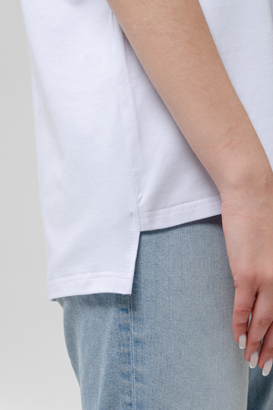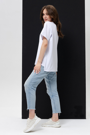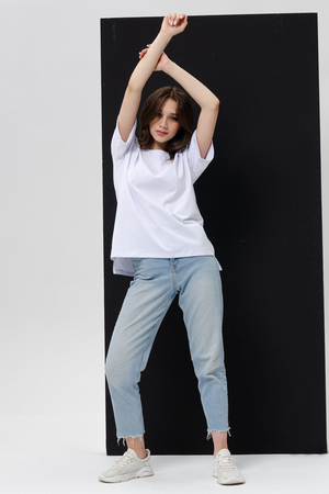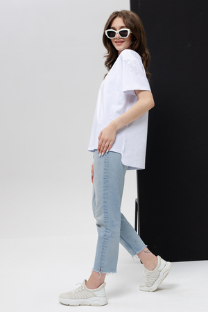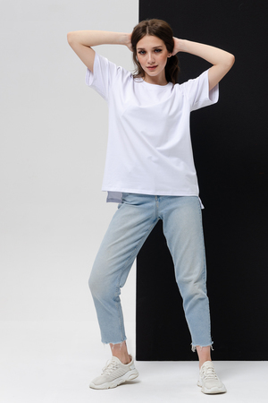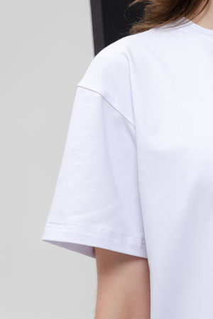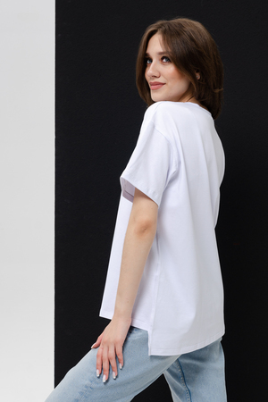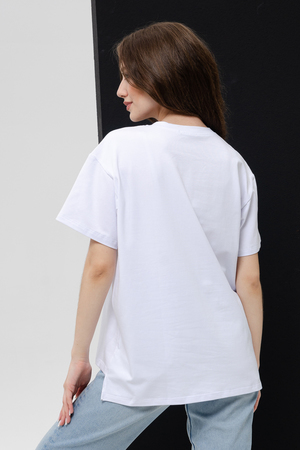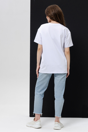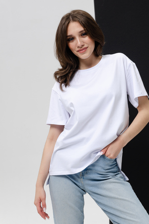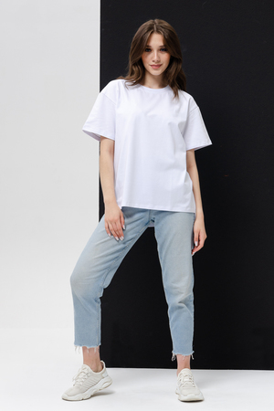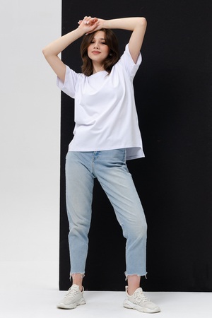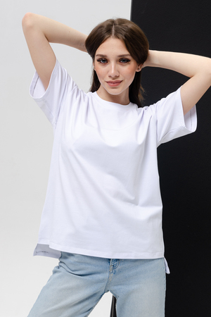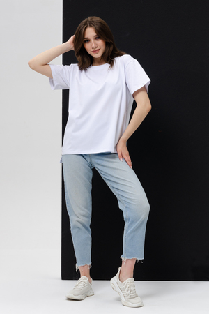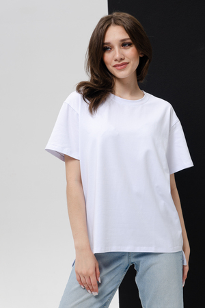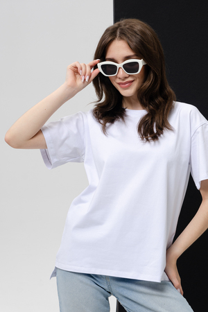 Футболка женская оверсайз свободного кроя со спущенным плечом. Модель выполнена из трикотажа, тактильно приятна к телу и не просвечивает. Футболка подходит для любого типа фигуры, так как имеет свободный крой. Свободную футболку можно сочетать с джинсами, джоггерами и юбками. Ткань футболок долгое время сохраняет свои первоначальные свойства.