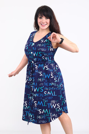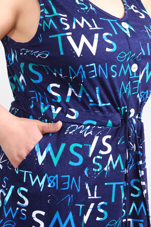 Платье женское без рукавов. Данная модель выполнена из трикотажного полотна кулирка (хлопок 100%). На полочке присутствуют накладные карманы и планка-обманка с пуговицами. Для того чтобы подчеркнуть силуэт в районе талии имеется кулиска. Горловина и пройма обработана окантовкой из основной ткани. Отличная модель для повседневной и домашней носки.