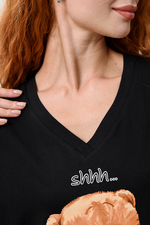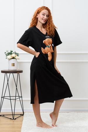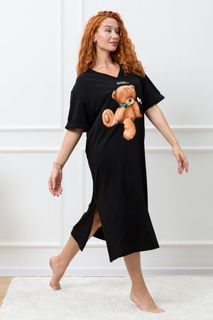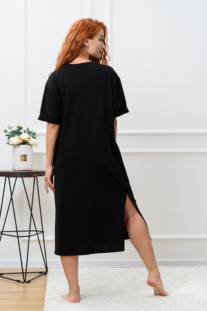 Платье в стиле "оверсайз". Прямое, свободное, с боковыми карманами, длиной до середины икры, с V-образной горловиной. Рукав короткий, с манжетом. В нижней части боковых швов обработаны разрезы. Горловина обработана обтачкой из основного полотна.