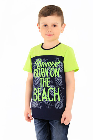 Футболка из однотонной кулирки, свободного покроя. Вырез горловины круглый, обработан эластичной обтачкой. Короткий, втачной рукав. Спереди футболка украшена принтом.