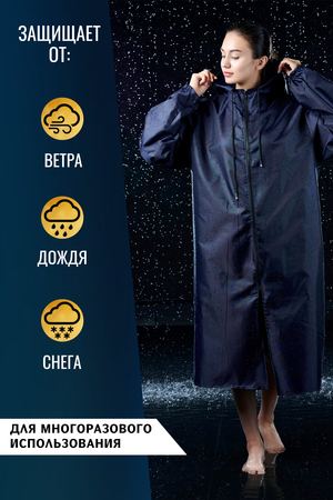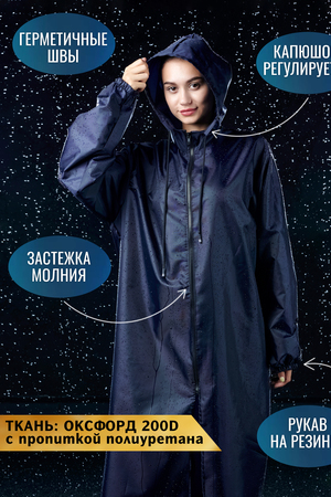Плащ-дождевик из влагооталкивающей ткани Оксфорд 200D Люкс с капюшоном на молнии и пропиткой PU(полиуретана) Кайлас! Забудем о зонтах, которые занимают место в сумке, постоянно ломаются и забываются. Мы создали уникальное изделие-плащ дождевик! Он подходит, как для мужчин, так и для женщин. Дождевик выпущен в двух размерах. Его внешний вид подойдёт не только для похода в лес, но и для города. Капюшон оснащён интересным шнуром, а тракторная молния придаёт вид этому изделию, словно верхний лёгкий плащ. Высокая горловина у дождевика надежно защитит вас от ветра. Резинка на манжете рукава плотно прилегает к руке. Для удобства, мы создали сумку для дождевика, которую можно повесить через плечо. Плотная ткань с влагоотталкивающей пропиткой надежно защитит вас от дождя.
