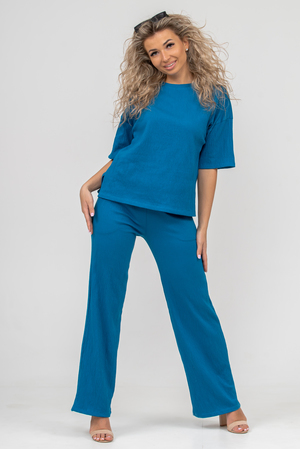 Модный стильный костюм - идеальное решение для тех, кто ищет лёгкую и красивую одежду на каждый день. Костюм, футболка и брюки, выполнен из кулирки гипе жатка компакт. Жатка - это ткань с "мятой" структурой, декоративными заломами и складками. Имеет много положительных качеств: хорошо тянется, упругая, красивая текстура, неприхотливая в уходе, прочная, износостойкая, не мнётся, не нуждается в глажке и приятная к телу. Футболка выполнена со спущенным рукавом, отстроченной обтачкой по горловине и двумя небольшими разрезами по бокам. На брюках имеется два вместительных боковых кармана и пояс, обработанный на специализированной поясной машине. Данная модель костюма очень удобна в качестве повседневной одежды, а универсальный фасон хорошо скроет недостатки и подчеркнет достоинства фигуры. Свободный крой комплекта "двойки" не сковывает движения, что делает его очень удобным в носке, резинка не перекручивается, а высокая посадка брюк - палаццо даёт ощущение комфорта. Такой костюм можно использовать как в качестве костюма для фитнеса, так и как вариант домашнего костюма, в нем также можно поехать на дачу или отправиться на вечернюю прогулку. Однотонный дизайн летнего брючного костюма без принта, надписей и декоративных элементов будет гармонировать с любым стилем одежды, а дополнить образ с модным костюмчиком можно любимыми аксессуарами и украшениями. Свободную футболку и брючки можно носить как вместе, так и отдельно. Футболку с коротким рукавом и разрезами по бокам можно легко сочетать с джинсами, юбками и шортами. К брюкам с карманами можно также подобрать любой верх. Образ с костюмом можно дополнить кроссовками, кедами или туфлями. Мягкий, прочный, хлопковый материал не дает усадку, не теряет форму после стирки и не линяет, его можно стирать в режиме бережной стирки при 30 градусах. Также данный трикотажный костюм не скатывается и не вытягивается за счет небольшого количества полиэстера в составе. Такой однотонный костюм с широкими брюками подойдет для разной возрастной категории. Он идеально подойдет для беременных и мам с детьми. Хорошо сядет на высоких и невысоких представительницах прекрасного пола всех возрастов. Такой универсальный прогулочный женский костюм станет отличным подарочным вариантом, его можно подарить маме, дочери, жене, бабушке, подруге или порадовать себя любимую даже без повода. Наш костюм благодаря своей практичности и лаконичному дизайну будет служить Вам долгие годы.
