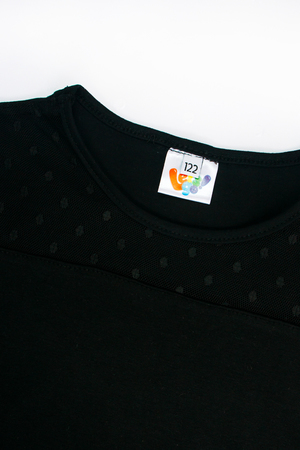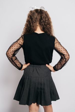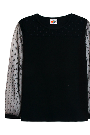 Джемпер для девочки прямого силуэта, с втачным длинным рукавом. Горловина круглая, обработана бейкой из кулирки. На полочке отрезная кокетка в цвет изделия в горошек. Рукав из сетки в цвет изделия в горошек. По низу рукава резинка, образует сборку.