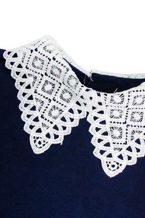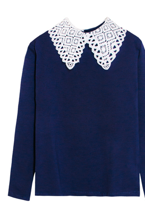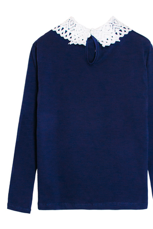 Джемпер для девочки прямого покроя, с втачным длинным рукавом. Горловина круглая, с отложным воротником из кружева. Низ изделия и рукава обработан швом в подгибку.