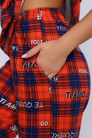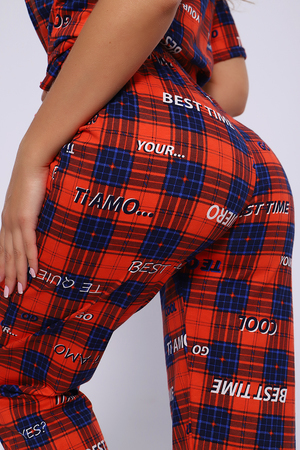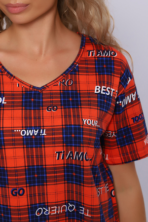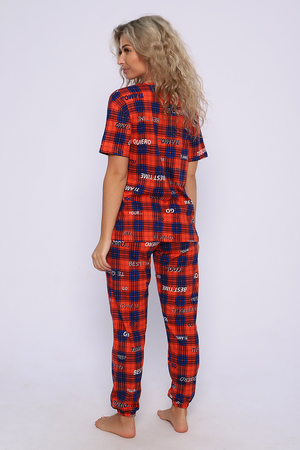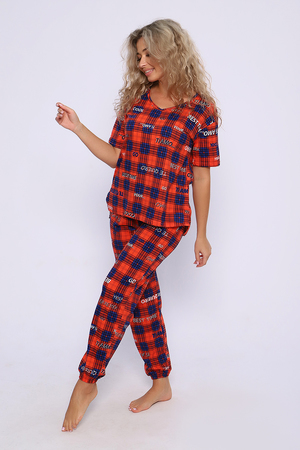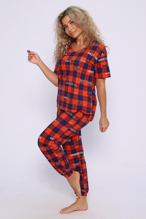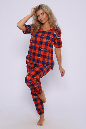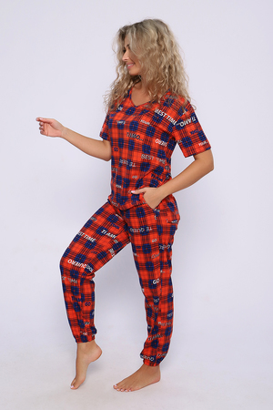 Костюм состоит из футболки и брюк. Футболка с короткими рукавами и V - образным вырезом горловины. Спинка у футболки удлиненная, а в боковых швах небольшие разрезы. Брюки с карманами, низ подогнут на резинку.