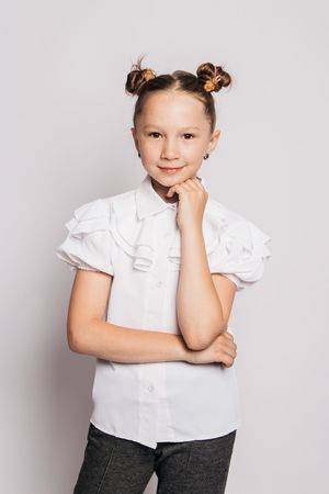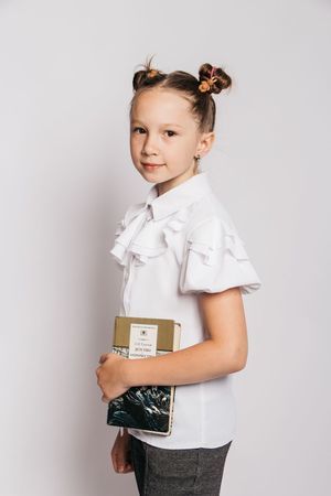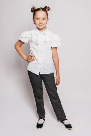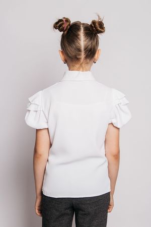 Джемпер для девочки прямого силуэта, с коротким рукавом. Горловина круглая обработана классическим воротником-стойкой с застёжкой на одну пуговицу. По горловине полочки и по окату рукава декоративные рюши. Низ рукава обработан в подгибку с эластичной тесьмой внутри. Низ изделия обработан в подгибку.