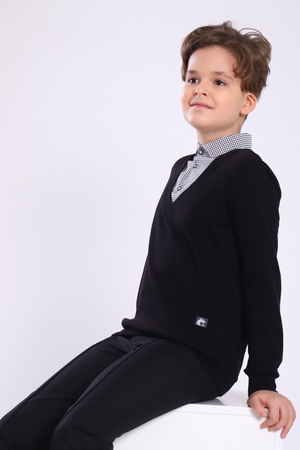 Джемпер-обманка Jersey Lab с длинным рукавом одновременно сочетает в себе 2 предмета гардероба: джемпер в классическом стиле и имитацию рубашки, с застежкой на пуговицы. Рубашку-обманку не нужно заправлять в брюки и она не выбивается из под одежды, как рубашка в классическом варианте. Изделия отшиваются из кулирки высокого качества пенье, низ рукавов и джемпера на манжете. Джемпер-рубашка - это оптимальное решение для создания стильных образов в школу и праздничных мероприятий. Джемпер для мальчика изготовлен из плотного хлопкового полотна, а воротник из рубашечной ткани.