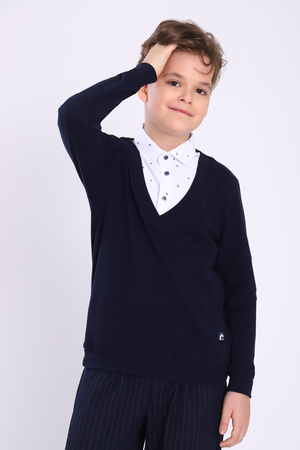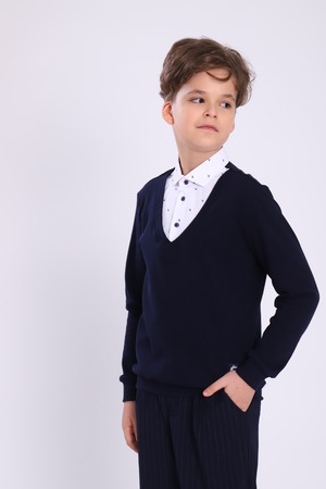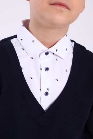 Джемпер-обманка Jersey Lab с длинным рукавом одновременно сочетает в себе 2 предмета гардероба: джемпер в классическом стиле и имитацию рубашки, с застежкой на пуговицы. Рубашку-обманку не нужно заправлять в брюки и она не выбивается из под одежды, как рубашка в классическом варианте. Изделия отшиваются из кулирки высокого качества пенье, низ рукавов и джемпера на манжете. Джемпер-рубашка - это оптимальное решение для создания стильных образов в школу и праздничных мероприятий. Джемпер для мальчика изготовлен из плотного хлопкового полотна, а воротник из рубашечной ткани.