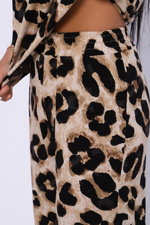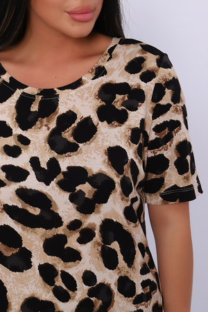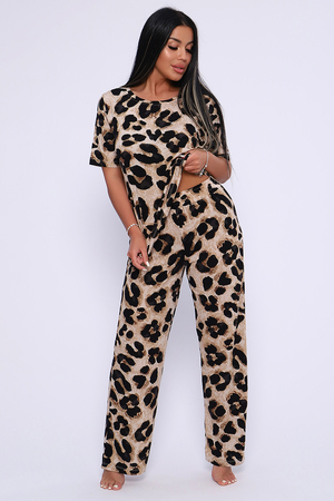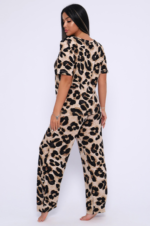 Женский костюм выполнен из вискозы, 95% вискоза, 5% лайкра. Костюм с брюками отлично подойдет как для дома, так и для активного отдыха или прогулки. Футболка полуприлегающего силуэта, рукава втачные, округлый вырез горловины. Костюм имеет стильный принт, который придает изделию индивидуальность. Брюки широкие, на поясе без карманов. Модель для повседневной носки, Вы будете чувствовать себя комфортно и уютно. Рекомендованный режим стирки t 30
