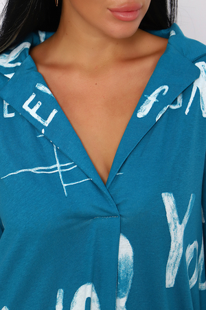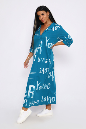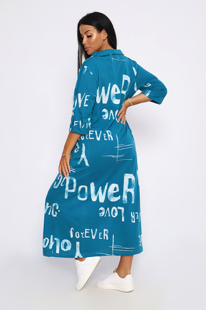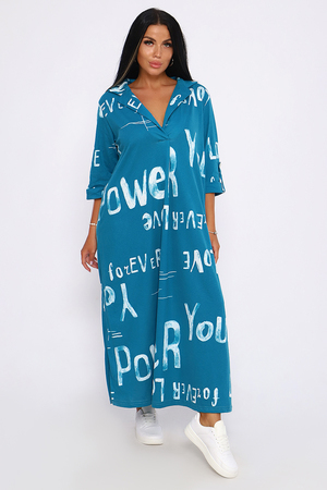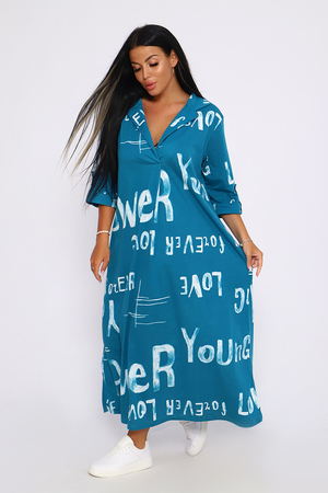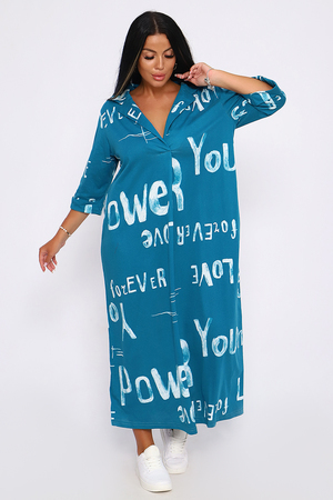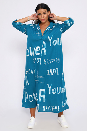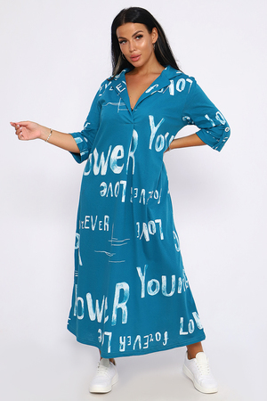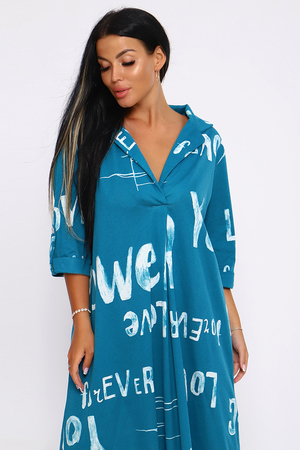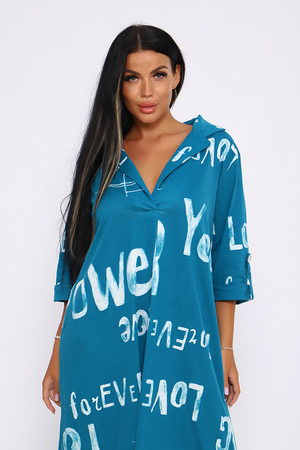 Женское платье свободного покроя, силуэта "овер-сайз". Рукав с манжетой длиной 3/4, поднят патой, закрепленной пуговицей контрастного цвета. Воротник отложной рубашечного типа образует V-образный вырез. Платье прекрасно подходит для беременных, не стесняет движений и скрывает недостатки. Для дома и дачи, на пляж, на прогулку, в офис. На любую фигуру. Приятные нежные расцветки с принтом по ткани в виде надписей, широкий размерный ряд, Прекрасный подарок любимым женщинам!