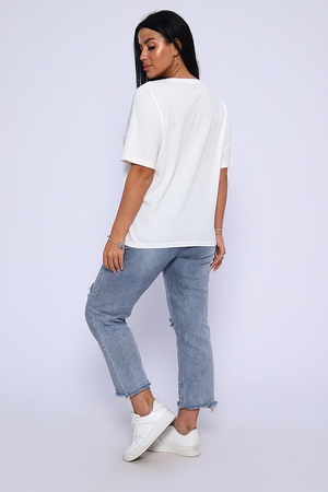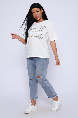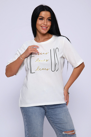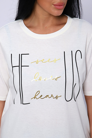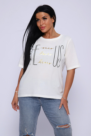 Футболка с благородным блеском золота на необыкновенно женственном принте HE US притягивает взгляд и позволяет чувствовать себя необыкновенной! Прямой силуэт, выверенная длина рукава до локтя, обработка деталей вкруговую с закрепкой. Горловина выполнена из основной ткани. Большие размеры!