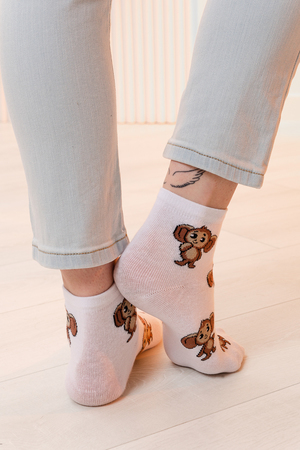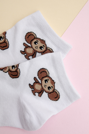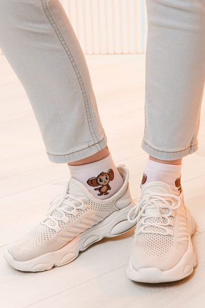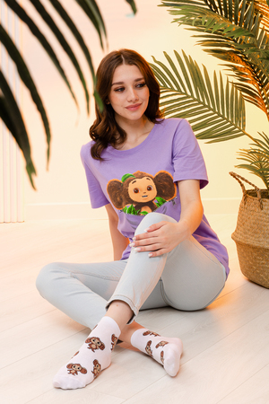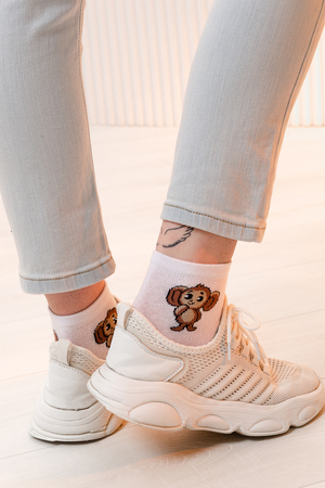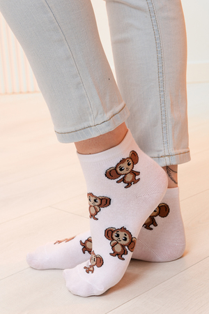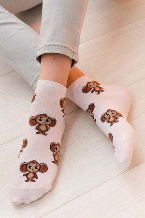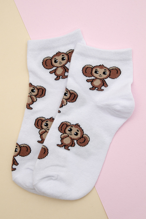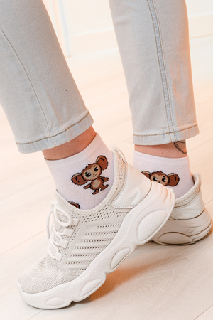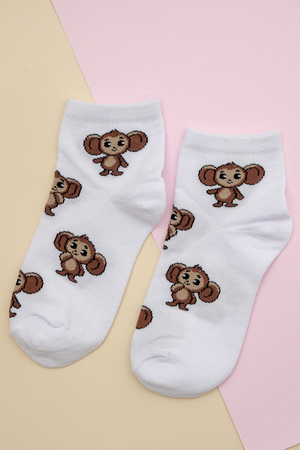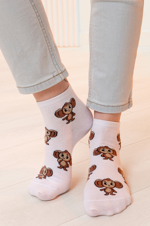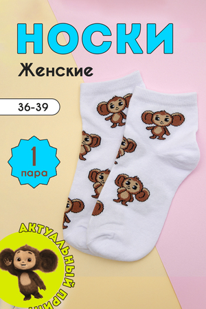 Женские носки со всем известным Чебурашкой. По всей верхней части изображение мульт героя Чебурашки. В комплекте 1 пара голубого или белого цвета на выбор.