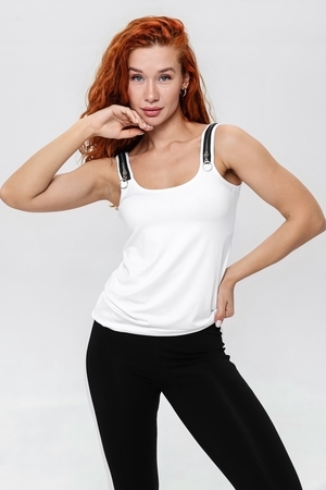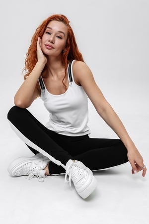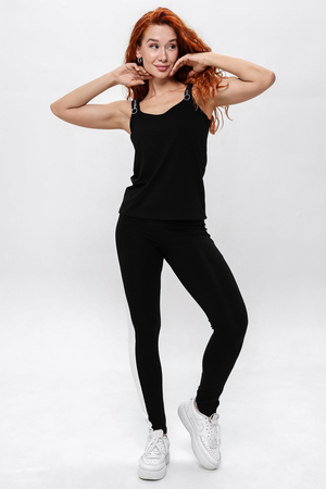Леггинсы облегающие, длинные, с завышенным уровнем талии, сверху на широком эластичном поясе. Вдоль боковых швов расположены контрастные вставки.