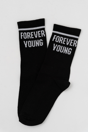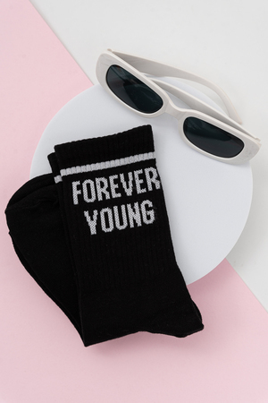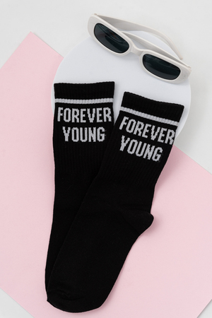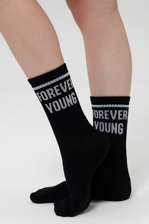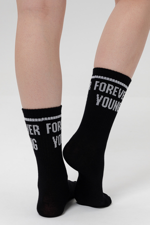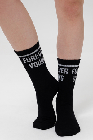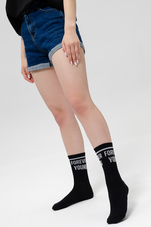 Стильные женские носки с высокой резинкой и надписью. Высокий паголенок, широкая резинка, прекрасно подходят для занятий спортом и повседневной носки, а также в качестве сувенира по любому поводу. В комплекте 1 пара черного или белого цвета на выбор.