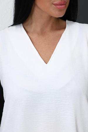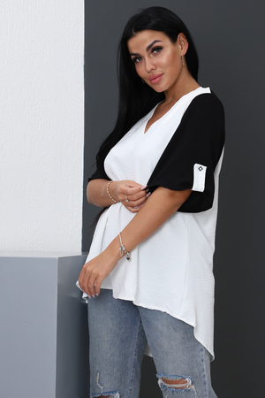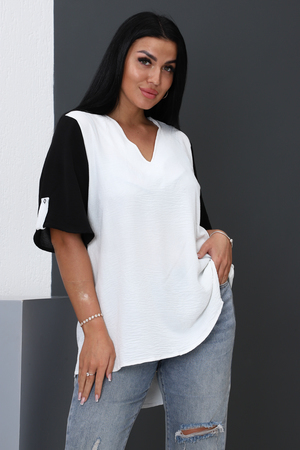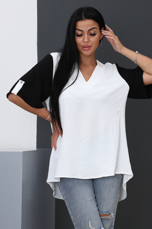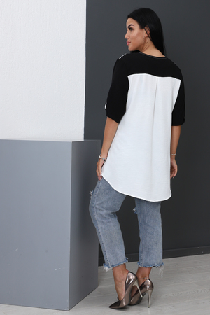 Туника женская комбинированная, расклешенного типа, рукав 3/4,V-образный воротник. Задняя полочка длиннее передней. Легкая и удобная.