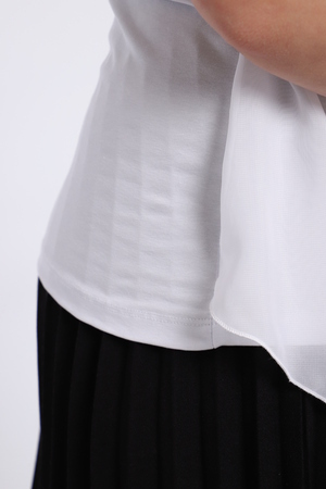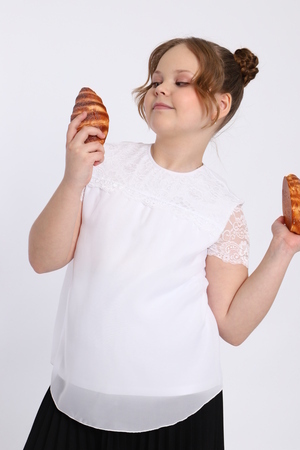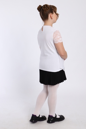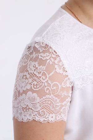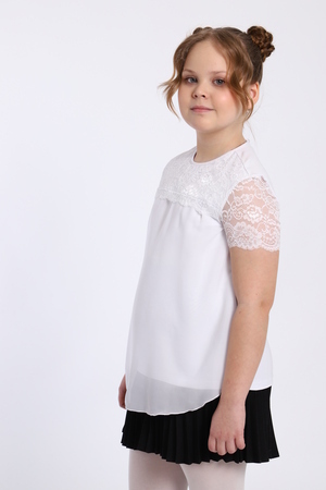Блузка трикотажная для девочки - вторая полнота! С красивой кружевной кокеткой и верхним слоем из шифона в тон блузке. Рукав кототкий - кружевной. Застегивается сзади на пуговку. Дополнительный шифоновый слой позволяет скрыть все нюансы фигуры. Силуэт свободный. Смотрится нарядно и подходит как для повседневной носки, так и для торжественных мероприятий. Будет находкой в гардеробе стильной школьницы. Выполнена из высококачественного турецкого трикотажного полотна состава 95% хлопок, 5% эластан. Мягкий и нежный трикотаж приятен к телу. Подойдет как школьная форма, нарядная и даже повседневная одежда для девочки. Стильные, модные блузки могут быть использованы как элемент к школьным сарафанам, юбкам и брюкам. Нарядные и строгие блузки школьные помогут сделать наряд школьницы привлекательным и элегантным.