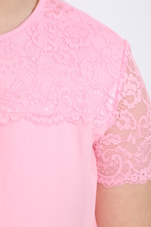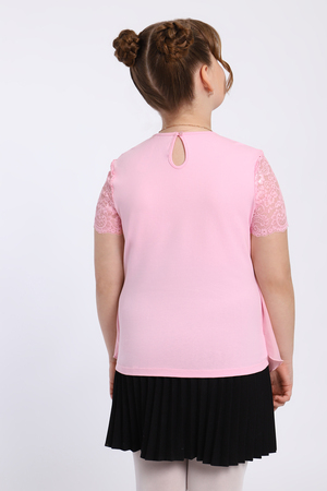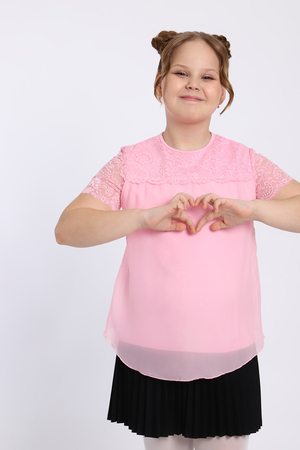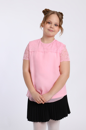 Блузка трикотажная для девочки - вторая полнота! С красивой кружевной кокеткой и верхним слоем из шифона в тон блузке. Рукав кототкий - кружевной. Застегивается сзади на пуговку. Дополнительный шифоновый слой позволяет скрыть все нюансы фигуры. Силуэт свободный. Смотрится нарядно и подходит как для повседневной носки, так и для торжественных мероприятий. Будет находкой в гардеробе стильной школьницы. Выполнена из высококачественного турецкого трикотажного полотна состава 95% хлопок, 5% эластан. Мягкий и нежный трикотаж приятен к телу. Подойдет как школьная форма, нарядная и даже повседневная одежда для девочки. Стильные, модные блузки могут быть использованы как элемент к школьным сарафанам, юбкам и брюкам. Нарядные и строгие блузки школьные помогут сделать наряд школьницы привлекательным и элегантным.