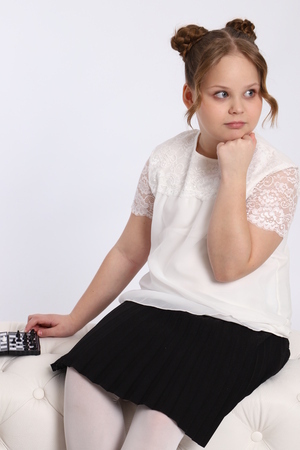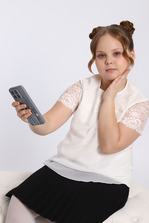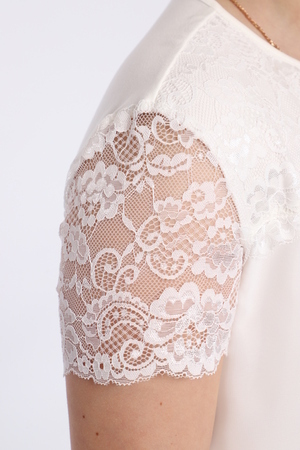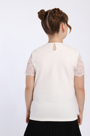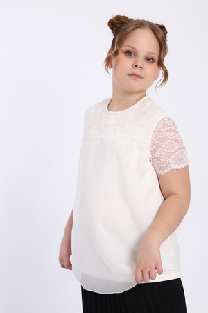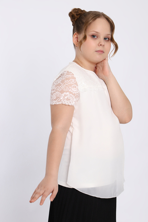 Блузка трикотажная для девочки - вторая полнота! С красивой кружевной кокеткой и верхним слоем из шифона в тон блузке. Рукав кототкий - кружевной. Застегивается сзади на пуговку. Дополнительный шифоновый слой позволяет скрыть все нюансы фигуры. Силуэт свободный. Смотрится нарядно и подходит как для повседневной носки, так и для торжественных мероприятий. Будет находкой в гардеробе стильной школьницы. Выполнена из высококачественного турецкого трикотажного полотна состава 95% хлопок, 5% эластан. Мягкий и нежный трикотаж приятен к телу. Подойдет как школьная форма, нарядная и даже повседневная одежда для девочки. Стильные, модные блузки могут быть использованы как элемент к школьным сарафанам, юбкам и брюкам. Нарядные и строгие блузки школьные помогут сделать наряд школьницы привлекательным и элегантным.