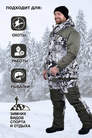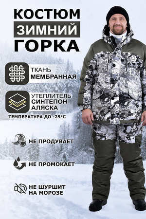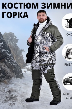 Костюм горка зимний мужской для активного отдыха. Горка зима выполнен из мембранной ткани, которая защитит вас от ветра и дождя. Зимний костюм для рыбалки состоит из куртки и полукомбинезона, утеплитель синтепон 450 гр. Куртка с центральной застежкой на молнию, с ветрозащитной планкой, застегивающаяся на шесть канадских пуговиц. Штаны дополнены двумя карманами и манжетами на резинке, чтобы обеспечить надежное прилегание и не допускать попадание влаги и грязи. Костюм зимний мужской Горка - отличный вариант спортивной одежды для активного отдыха рыбалки и охоты. Костюм туристический это еще и универсальный подарок мужчине на любой праздник Новый Год, 23 Февраля. Куртка с центральной застежкой на молнию, с ветрозащитной планкой, застегивающаяся на шесть канадских пуговиц. На груди прорезные карманы на молнии. Два нижних накладных кармана с фигурным клапаном. По линии талии находится кулиса. Капюшон регулируется кулисами и фиксатором. Рукава с фигурными налокотниками и трикотажными манжетами, по линии локтя кулиса, выше расположены накладные карманы с фигурными клапанами. По низу куртки, для регулировки объема, предусмотрена кулиса.