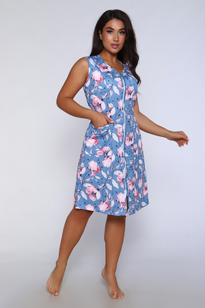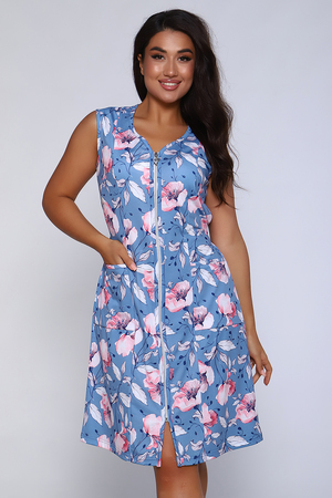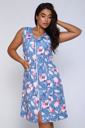 Женский домашний халат без рукавов с фигурным вырезом и на молнии с декоративной собачкой в виде сердечка. Для комфортного ношения халат снабжен двумя накладными боковыми карманами из основной ткани и разрезом спереди снизу. По бокам вшит пояс, который завязывается сзади на спинке, что дает возможность женственно приталить халат. Изделие выполнено из трикотажного полотна нового поколения с цифровой печатью - мерис, эта ткань не меняет цвет рисунка в процессе стирки. Содержание полиэстера в ткани позволяет изделию не менять свою форму в процессе носки и практически не мнется. Усадка минимальна. Широкий размерный ряд с 44 по 62. Рекомендована стирка при 30-40 градусах в стиральной машине. Для дома и дачи. Отличный подарок любимым женщинам!