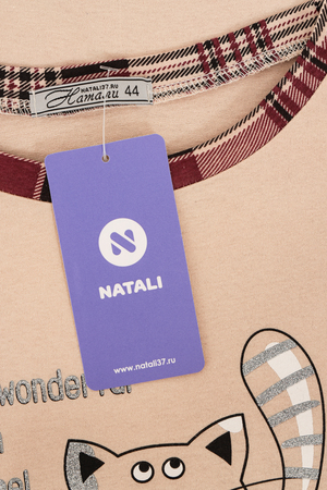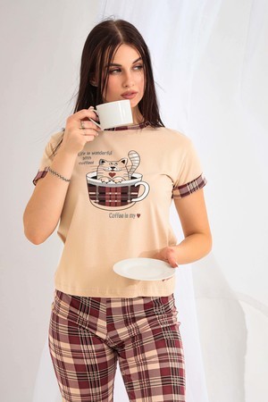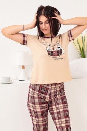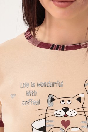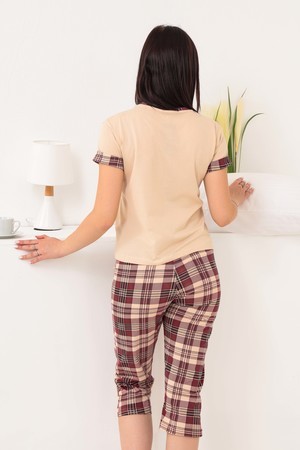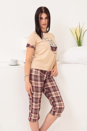 Уютная пижама с оригинальным принтом из очень мягкой, приятной к телу ткани. Футболка с спущенной линией плеча. Бриджи свободного кроя. В измерениях в обхвате талии указана длина резинки. Может использоваться как домашний костюм.