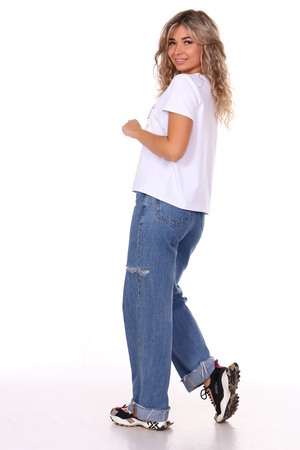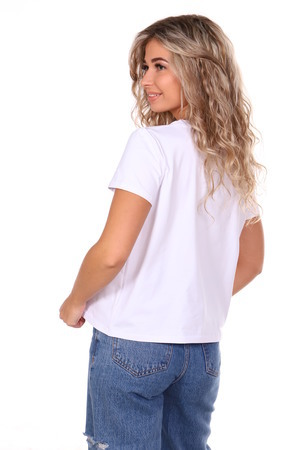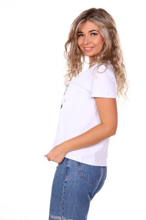 Футболка женская с оригинальным принтом, из хлопковой ткани с лайкрой. Ткань держит форму, не вытягивается, приятная на ощупь. Стильная футболка оригинального фасона. Посадка свободная.