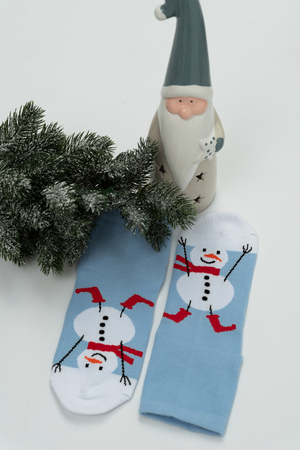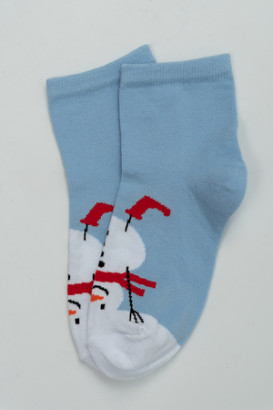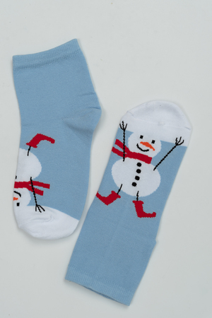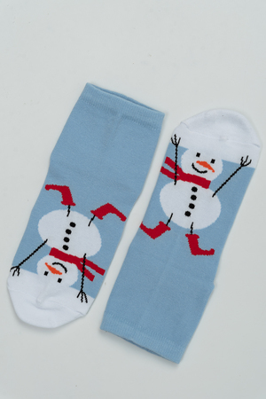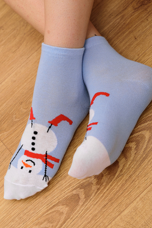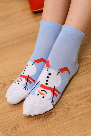 Новогодние женские носки. На основной части носка яркой изображение снеговика.
