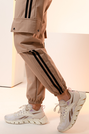 Крой ветровки укороченный, с воротником-стойка, по рукавам контрастные полоски. Брюки в стиле карго с полосками по бокам, высокой посадкой имеют прямой крой, брюки будут держать модную планку еще несколько сезонов. За счет своего удобства и комфорта этот фасон стремительно набирает популярность. Легкий комплект произведен с учетом большинства особенностей фигур. Исходя из этого, отлично подойдет как для худеньких девушек и подростков, так и для полных, как для высоких, так и для среднего роста женщин.