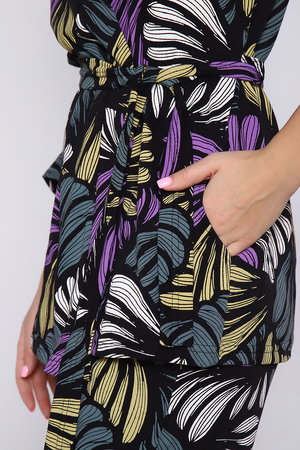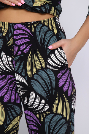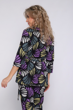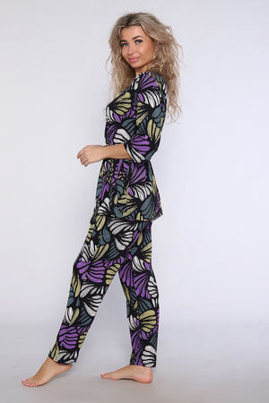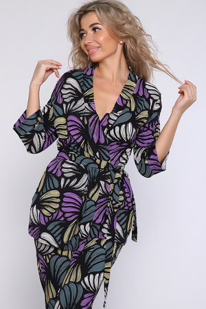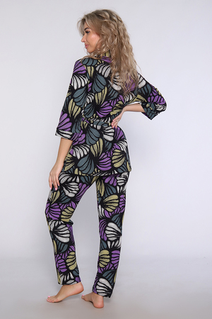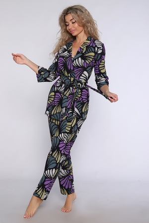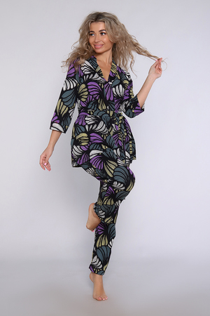 Домашний костюм состоит из укороченного халата и брюк. Брюки прямые с карманами. Халат запашной на поясе. Рукав 3/4 с манжетом. В боковых швах карманы. Удобный и практичный вариант для дома и сна.