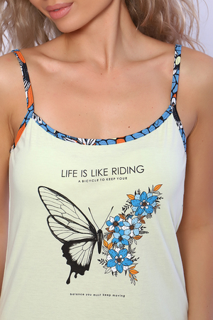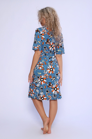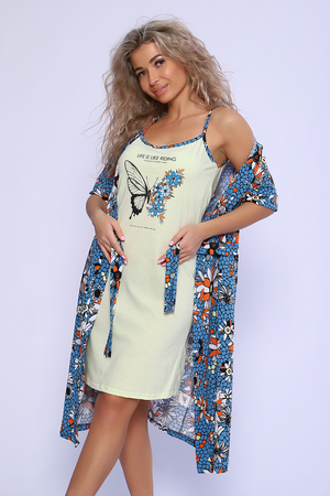 Пеньюар состоит из халата и сорочки. Сорочка прилегающего силуэта на тонких бретелях с принтом на полочке. Халат запашной с поясом, рукава короткие на манжетах, карманы в боковых швах. Неотъемлемый элемент домашнего гардероба, комфортный для отдыха и сна.
