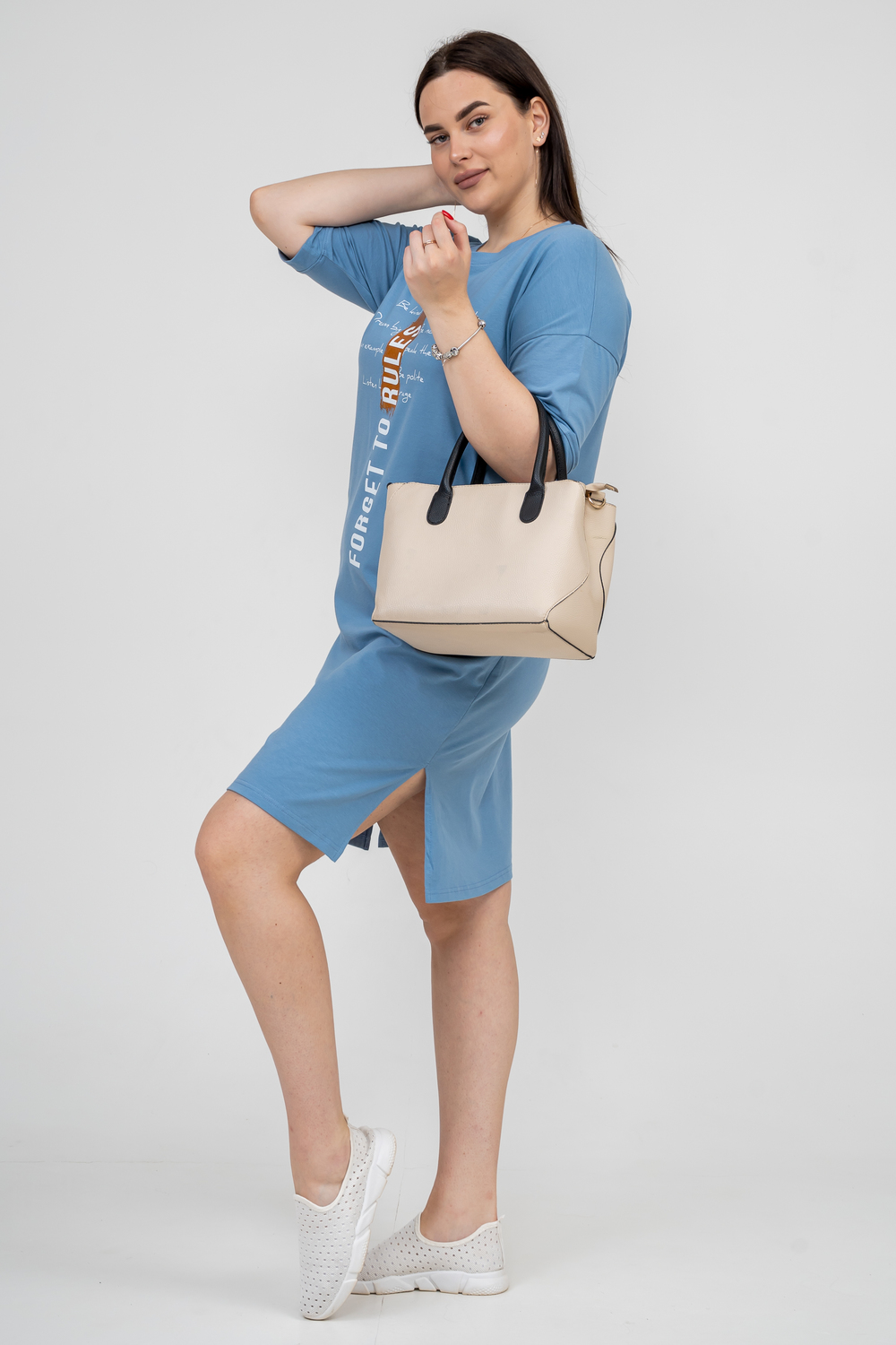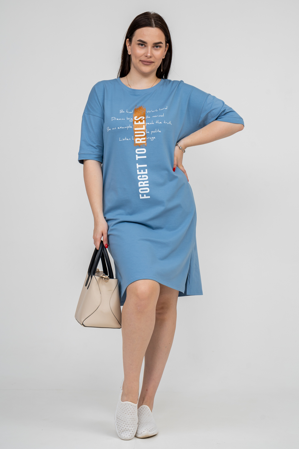 Платье для женщин прямого силуэта, с разрезами по бокам длиной ниже колен. Горловина округлая, рукав втачной короткий. Полочка изделия украшена принтом.