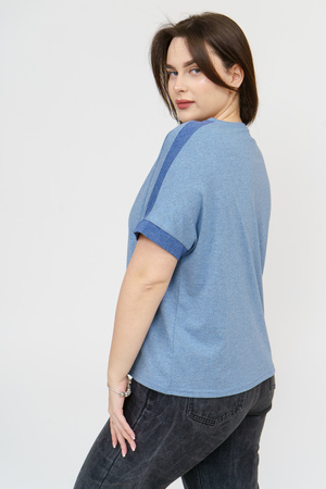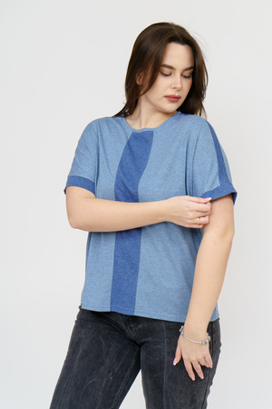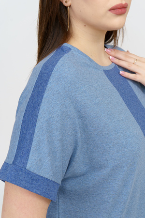 Футболка для женщин, прямого силуэта, укороченная. Вырез горловины округлый. На полочке и плечах изделия контрастная вставка.