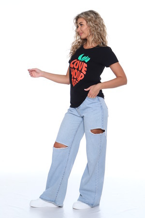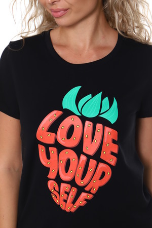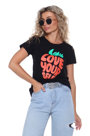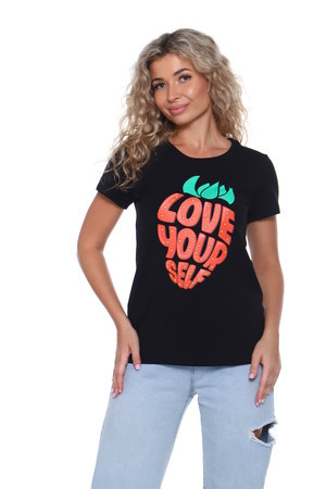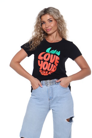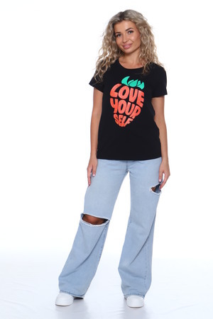 Футболка женская с оригинальным принтом, из хлопковой ткани с лайкрой. Ткань держит форму, не вытягивается, приятная на ощупь. Стильная футболка оригинального фасона. Посадка свободная.