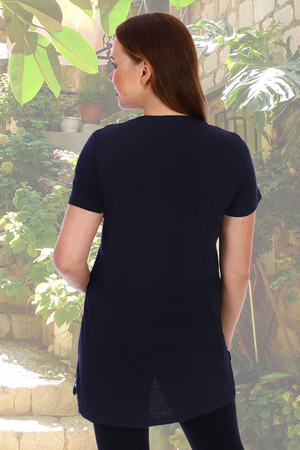 Короткая туника из кулирки. Темный фон, геометрические узоры. Рукава короткие, на груди две декоративные пуговицы.