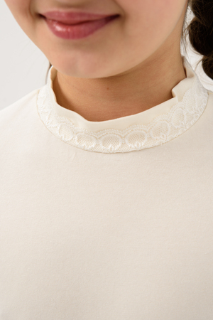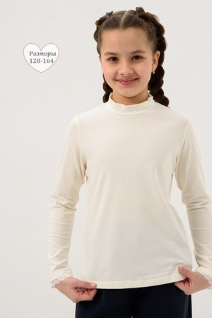 Базовая школьная блузка для девочек с длинным рукавом. Нарядная блузка станет основой повседневного образа. Мягкое кружево по воротнику - стойке и низу рукава придает модели нежности. Модель составит одинаково удачный комплект и с юбкой, и с брюками. Блузка сшит из качественного трикотажа, используемый материал не теряет форму после многократных стирок, мягкий и приятный к телу, устойчив к износу. Для сохранения первоначальных свойств изделия, важно соблюдать рекомендации по уходу.