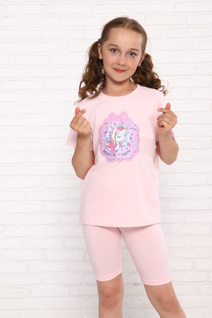 Футболка для девочек дошкольного и младшего школьного возраста, из однотонного трикотажного полотна кулирка с лайкрой. Футболка прямого силуэта, с втачным рукавом, с обтачкой в горловине. Спереди и на спинке отсутствуют линии членения. Рукав одношовный. Низа рукавов и изделия подогнуты. По шву втачивания обтачки в горловину проложена отделочная строчка. Спереди настрочена декоративная нашивка.