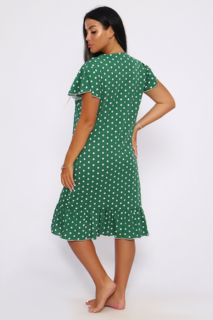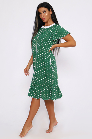 Халат женский домашний из кулирки с принтом длиной ниже колен. Халат полуприталенного силуэта с рельефами. Халат с центральной застежкой на тесьму - молнию. Перед с круглым вырезом и круглым воротником из отделочного однотонного материала с рельефами из линии проймы. С двумя симметричными карманами. Вход в карман прямой из ткани отделки. Рукава втачные короткие.
