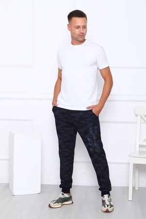 Брюки мужские "Камуфляж" с боковыми карманами и с тематическим принтом на левой штанине, низ на манжетах, комфортный широкий эластичный пояс. Материал устойчив к растягиванию на коленях, износостойкий.