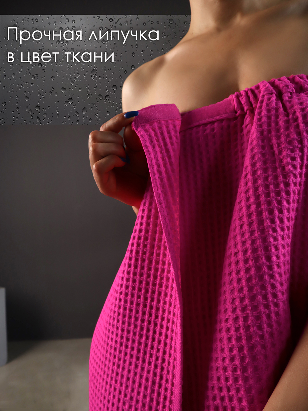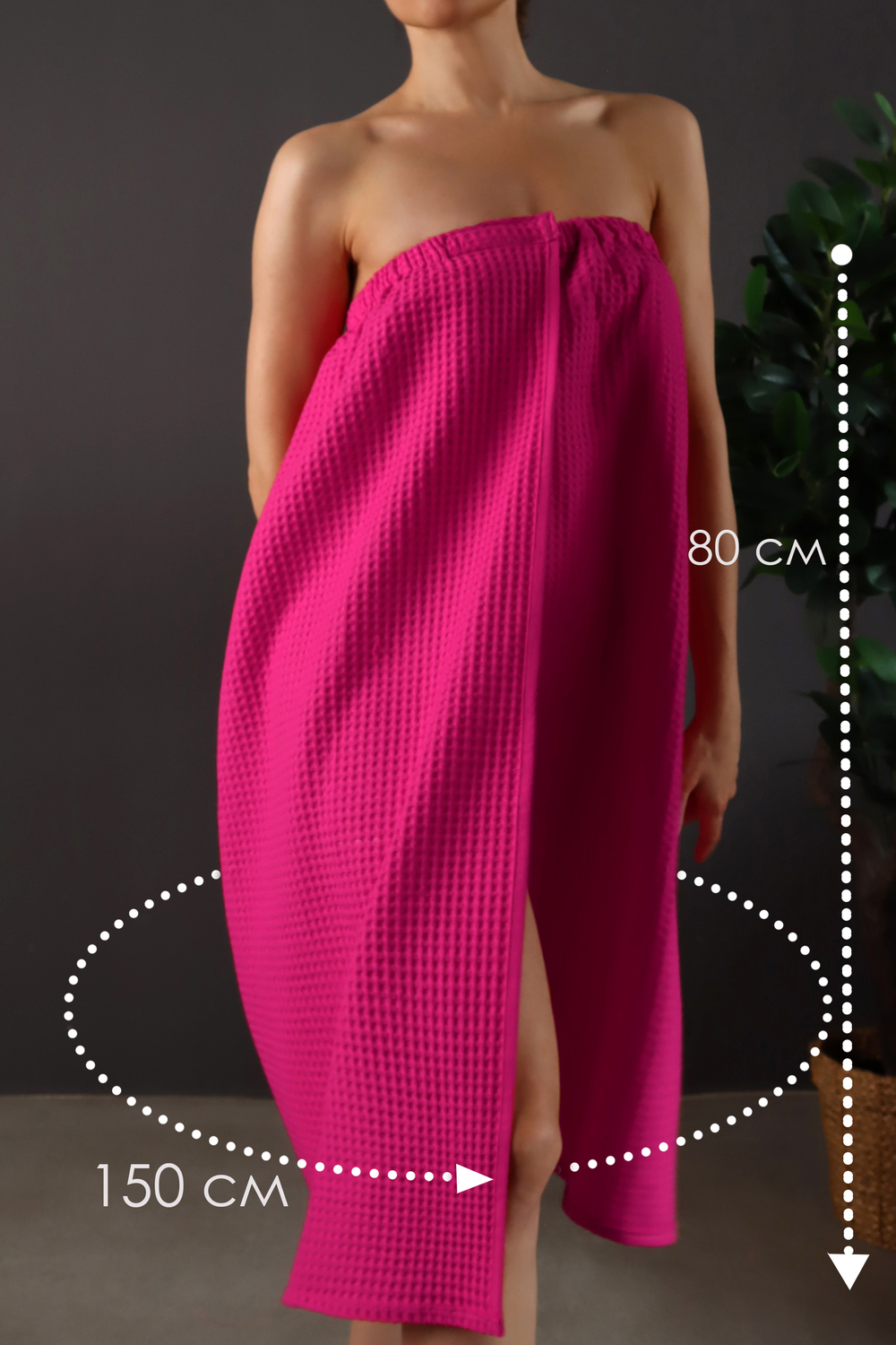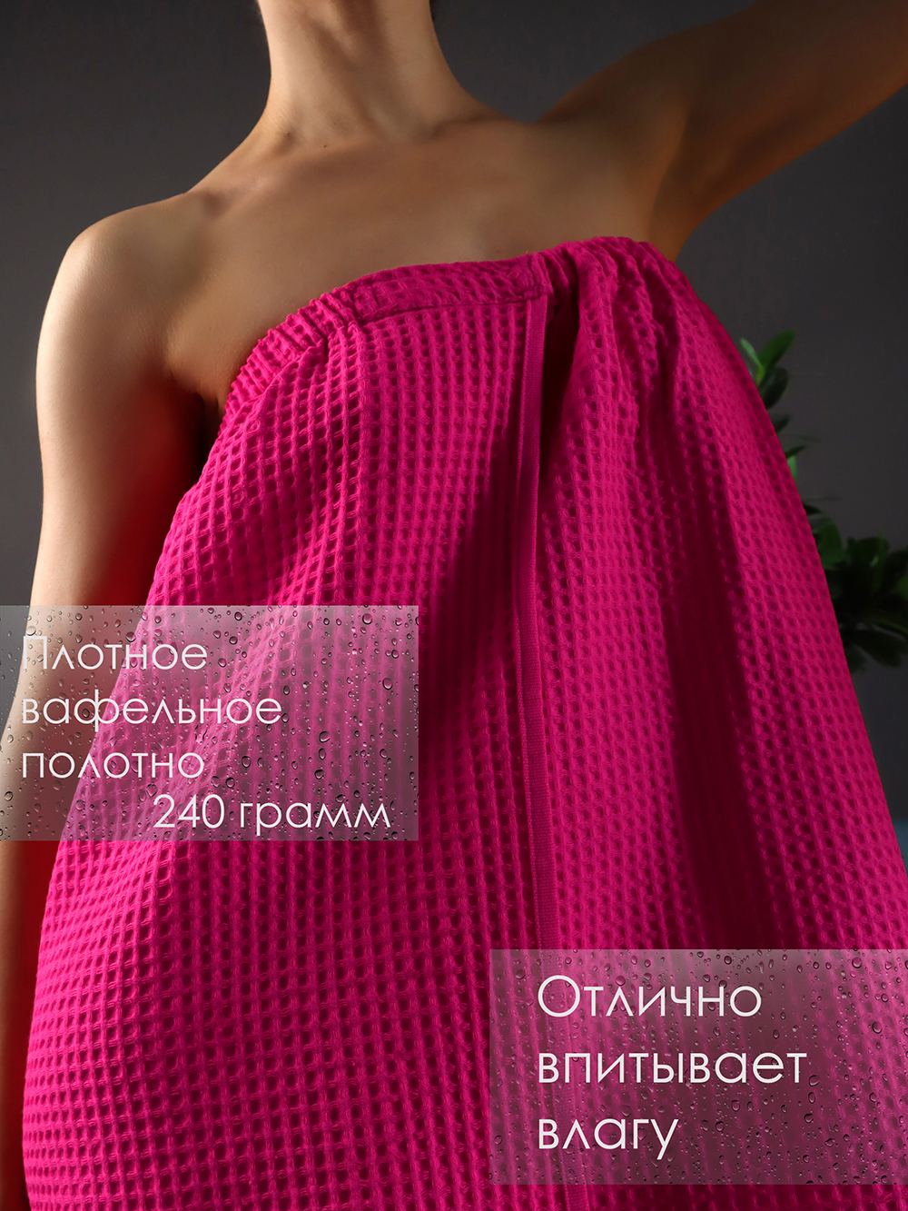 Накидка для сауны женская вафельная. Состав: 100 % хлопок. Плотность "вафли": 240 г/м2. Накидка для бани отлично держится на теле за счет липучки спереди и вшитой резинки. Килт банный подходит для женщин любой комплекции с 42 по 56 размер. Полотенце на липучке вафельное прекрасно впитывает влагу, хорошо переносит частые стирки и быстро сохнет. В отличие от полотенца из микрофибры не вызывает аллергию и не электризуется. Может заменить большое полотенце махровое 70х140 см, накидку пляжную, парео или уголок для ванной. Это замечательный подарок женщине на 8 марта, новый год, юбилей. Подходит любительницам ванны, парной, хаммама, сауны, бани, бассейна, спа, массажа, а также товаров для кемпинга, пикника и отдыха, пляжных аксессуаров. Отличный вариант для дачи и огорода, отдыха на море. Размер накидки после стирки 75х150. После стирки изделие дает усадку в 5см.