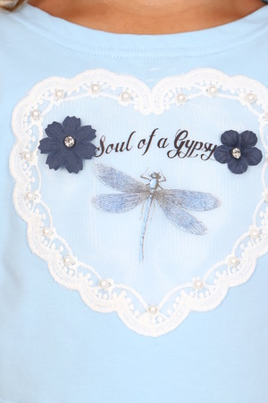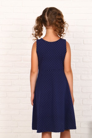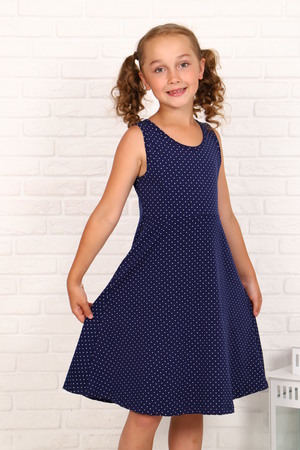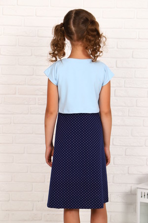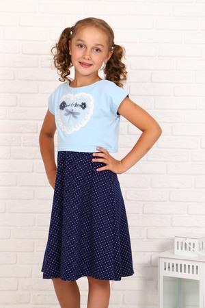 Платье для девочек дошкольного и младшего школьного возраста, из трикотажного полотна кулирка с лайкрой однотонного и набивного. Платье представляет собой комплект из безрукавного платья и футболки. Длина футболки до линии талии. Рукав цельнокроенный. Горловина в форме лодочки. Рукава, горловина и низ футболки подогнуты. Платье прилегающего силуэта, расклешенное от линии талии. Перед и спинка по линии талии делятся на верхние и нижние части. Горловина и проймы окантованы. Низ платья подогнут. На детали переда футболки вышит рисунок с аппликацией и настрочена декоративная лента.
