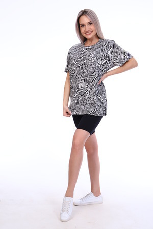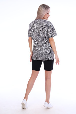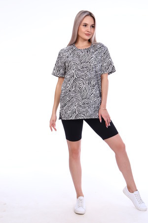 Комплект состоит из футболки и бриджей. Свободная футболка. Бриджи плотно прилегающие. Футболка изготовлена из интерлока 100 % хлопок. Бриджи изготовлены из кулирки с лайкрой 95% хлопок, 5% лайкра. Комплект, подойдет на любой тип фигуры.