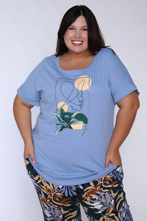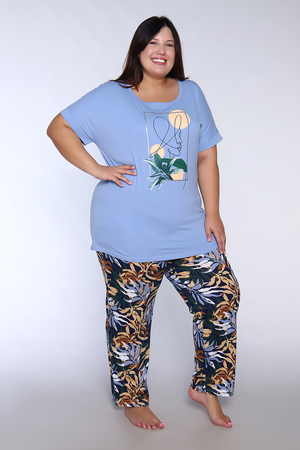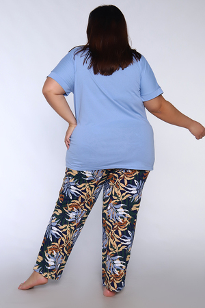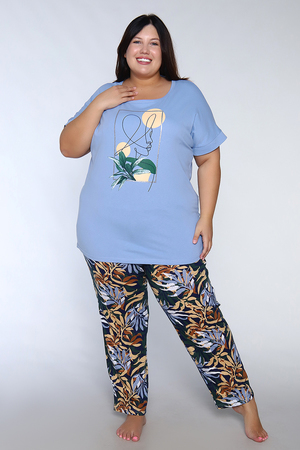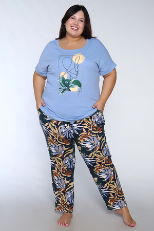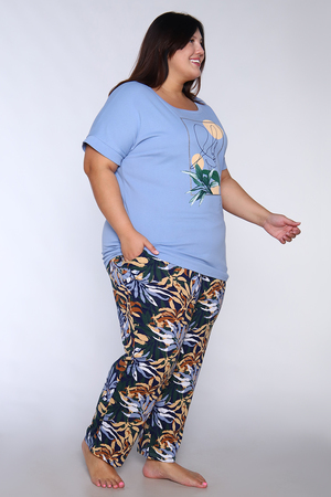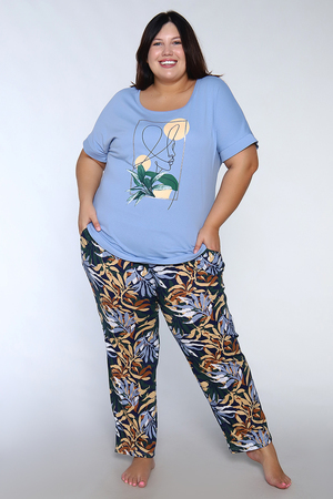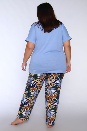 Женский костюм состоит из брюк и футболки полуприлегающего силуэта. Костюм выполнен из мягкого трикотажа (100% хлопок). Брюки свободные с двумя боковыми карманами, на широком поясе с резинкой.