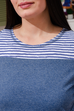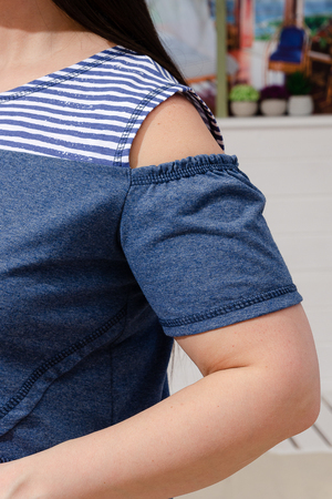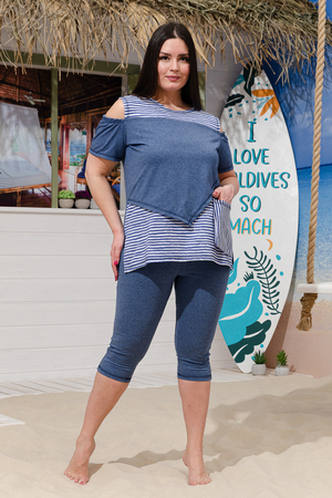 Костюм женский: Туника и бриджи. Туника прямого силуэта, слегка расширенная к низу. В ней хорошо сочетаются ткани в полоску и меланжевая. Верхняя часть рукава отсутствует, верхний срез собран благодаря эластичной тесьме. На полочке и спинке кокетки, полочка состоит из трех частей, верхняя часть отлетная. Отдельно изготовленный карман настрочен на полочку. Бриджи облегающие из х/б ткани с лайкрой.