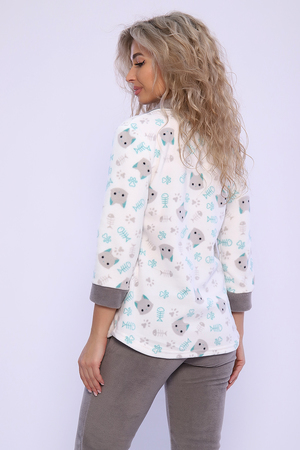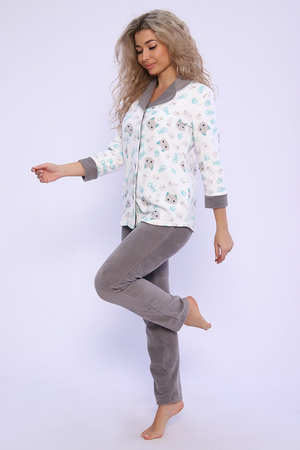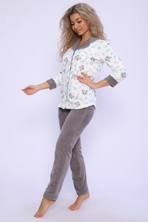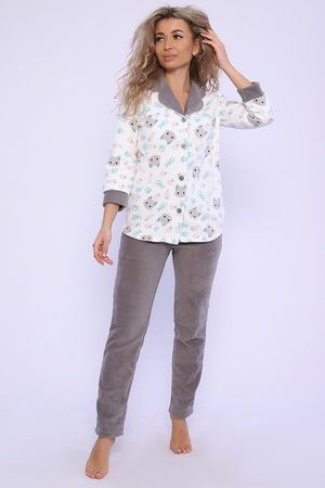 Домашний женский костюм из мягкого, теплого флиса. Кофта полуприлегающего силуэта, застегивается на петли и пуговицы. Длиной до бедер с фигурной линией низа. Рукав втачной, длиной 3/4 с манжетом из отделочной ткани. Воротник пиджачного типа с закругленными углами, из отделочной ткани. Борта, воротник и лацканы отстрочены. Домашние брюки прямого кроя с вместительными карманами в боковом шве, комфортный пояс на резинке, располагается на линии талии, длина брюк ниже щиколотки.