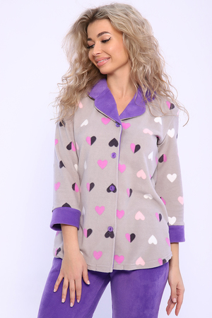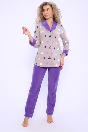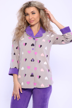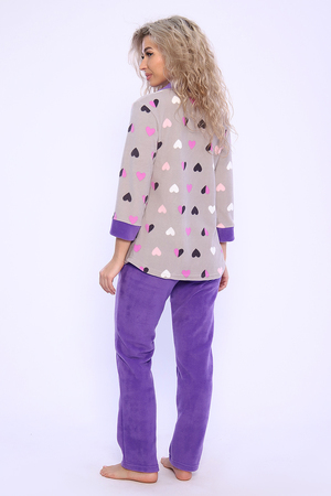 Домашний женский костюм из мягкого, теплого флиса. Кофта полуприлегающего силуэта, застегивается на петли и пуговицы. Длиной до бедер с фигурной линией низа. Рукав втачной, длиной 3/4 с манжетом из отделочной ткани. Воротник пиджачного типа с закругленными углами, из отделочной ткани. Борта, воротник и лацканы отстрочены. Домашние брюки прямого кроя с вместительными карманами в боковом шве, комфортный пояс на резинке, располагается на линии талии, длина брюк ниже щиколотки.
