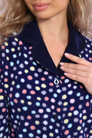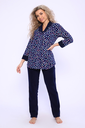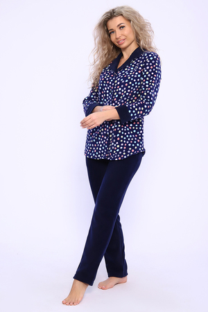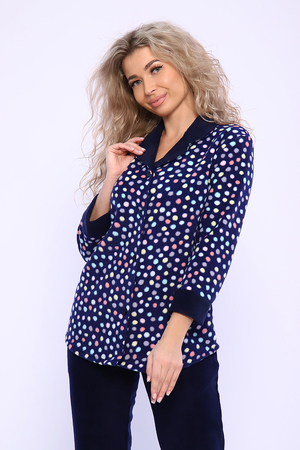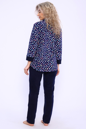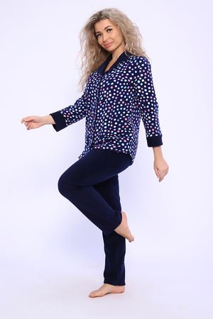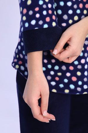 Домашний женский костюм из мягкого, теплого флиса. Кофта полуприлегающего силуэта, застегивается на петли и пуговицы. Длиной до бедер с фигурной линией низа. Рукав втачной, длиной 3/4 с манжетом из отделочной ткани. Воротник пиджачного типа с закругленными углами, из отделочной ткани. Борта, воротник и лацканы отстрочены. Домашние брюки прямого кроя с вместительными карманами в боковом шве, комфортный пояс на резинке, располагается на линии талии, длина брюк ниже щиколотки.
