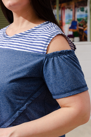 Платье прямого силуэта, слегка расширенное к низу. В модели хорошо сочетаются ткани в полоску и меланжевая. Верхняя часть рукава отсутствует, верхний срез собран благодаря эластичной тесьме. На полочке и спинке кокетки, полочка состоит из трех частей, верхняя часть отлетная. Отдельно изготовленный карман настрочен на полочку.