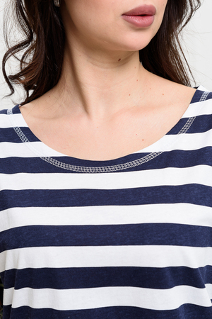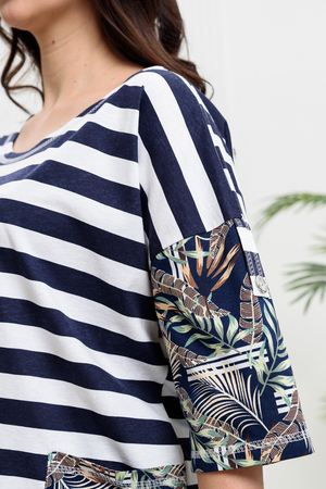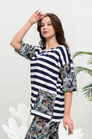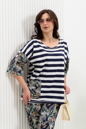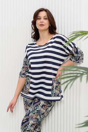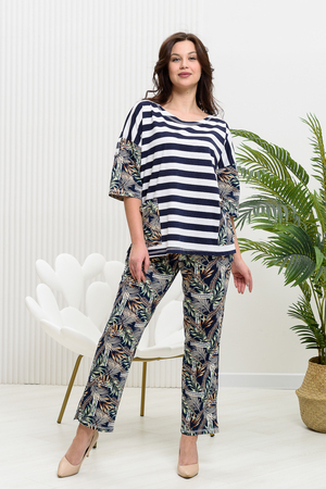 Костюм женский: туника и брюки. Туника прямого силуэта с округлой горловиной. Рукав цельнокроенный со швом, ниже локтя. На полочке два накладных кармана. Брюки полуприлегающие, с притачным поясом, изготовленном на многоигольной машине. На передней части брюк два внутренних кармана. В боковых швах внизу брюк маленькие разрезы. Костюм достаточно творческий за счет использования ткани в широкую полоску и цветочного принта.