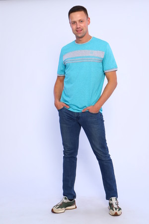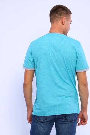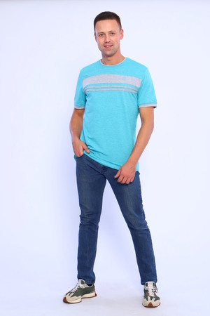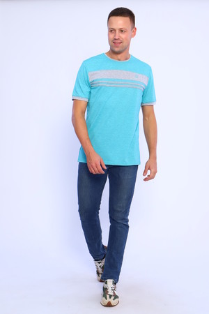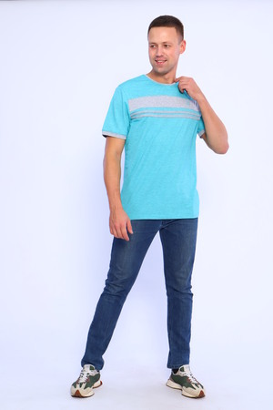 Мужская футболка из кулирки с лайкрой. Короткие рукава, круглая горловина, цветные вставки, прямой силуэт. Четыре расцветки — бирюзовая, голубая, темно-синяя и серый меланж