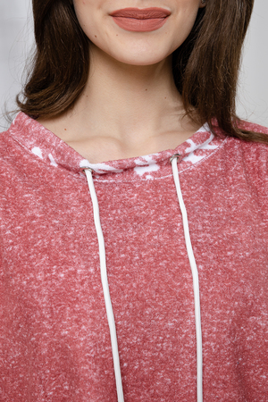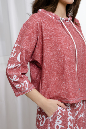 Костюм состоит из туники и брюк. Туника прямого силуэта, со спущенной проймой, с округлой горловиной. Рукав длинной 3/4, со вставкой из отделочного полотна вдоль рукава. Горловина обработана обтачкой из отделочного полотна, со шнуром. Брюки прямые, свободные, на поясе, с боковыми накладными карманами.